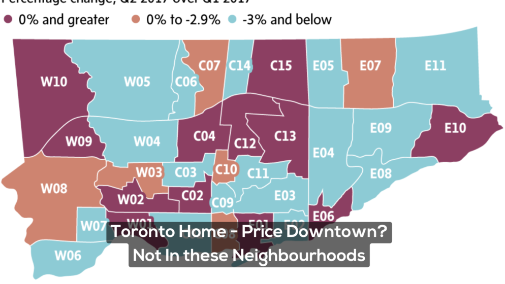 Prices fell most sharply in the central downtown neighbourhood known as C09, which runs north of Bloor between Yonge and the Don Valley, dropping 21.6 per cent in the second quarter. Prices in the C01 district, in the heart of the downtown core north of Lake Ontario between Yonge and Dufferin, dropped 19.7 per cent in the second quarter.